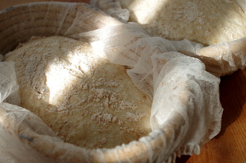 Сформуйте овальные или круглые заготовки и уложите расстаиваться в корзинки швом вверх. В самом начале расстойки включите духовку греться до 240-250 градусов вместе с колпаком и камнем.