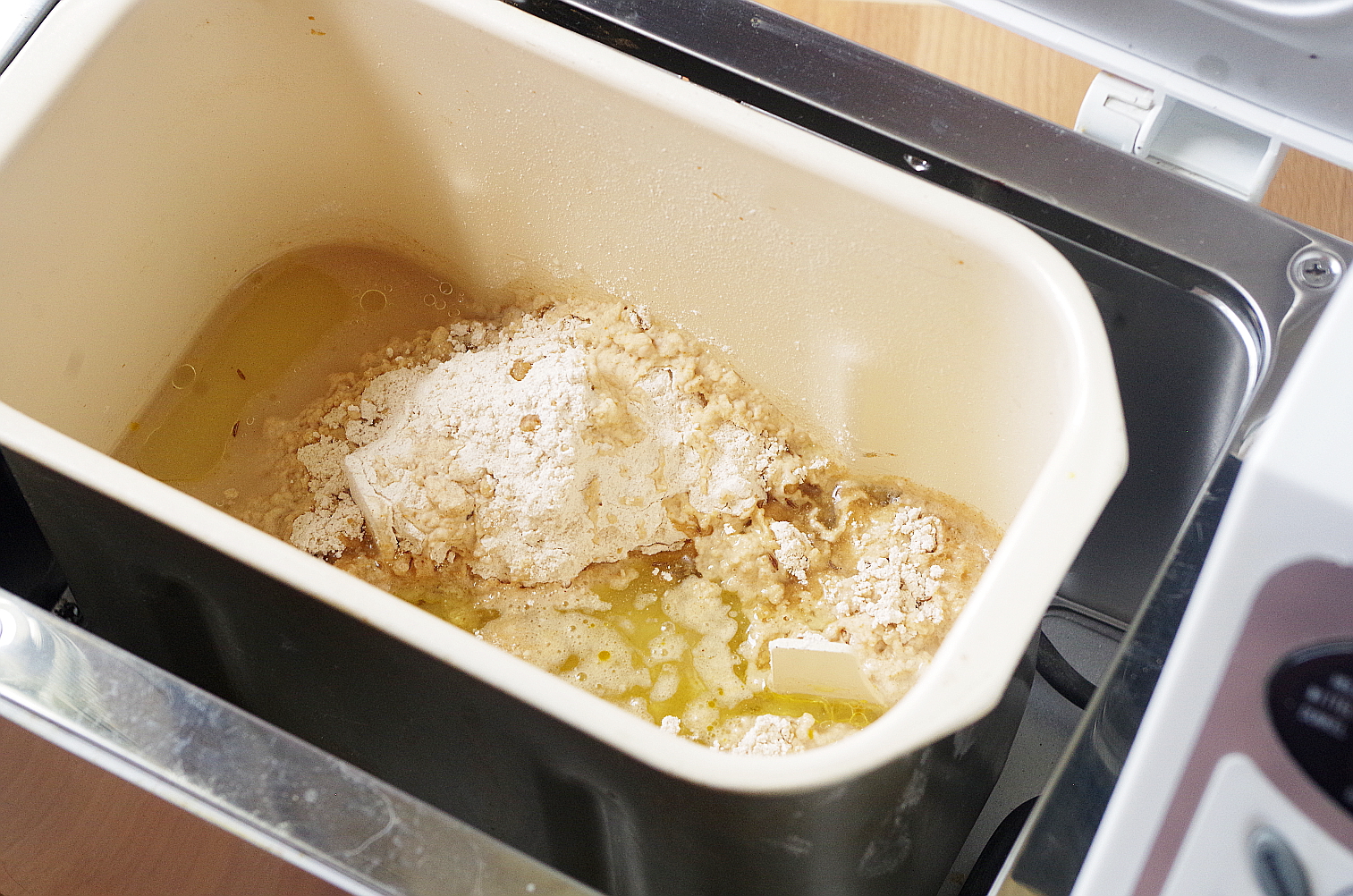 Но вернемся к хлебу. Я решила печь его на свежих дрожжах, по рецепту нужно было взять 5 гр. свежих или 3 гр. сухих. Я взвесила всю необходимую воду, потом дрожжи, отлила от уже взвешенной воды немного, чтобы активировать дрожжи со щепоткой сахара. Через 10 минут, после появления дрожжевой шапочки, вылила все в ведерко хлебопечки, туда же – дрожжи, высыпала содержимое пачки, установила ведерко в ХП и выбрала в меню базовую программу продолжительностью 3,5 часа. Вот немного фото процесса: