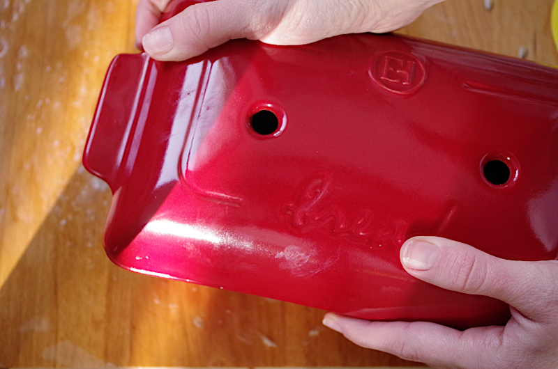 Я не делила и пользовалась такой керамической формой от Emile Henry. Эту форму я предварительно нагрела и намазала воском, который при этом плавился, потом остудила. К такой форме теперь ничего не прилипнет!