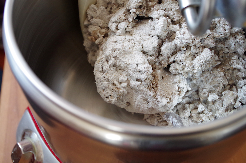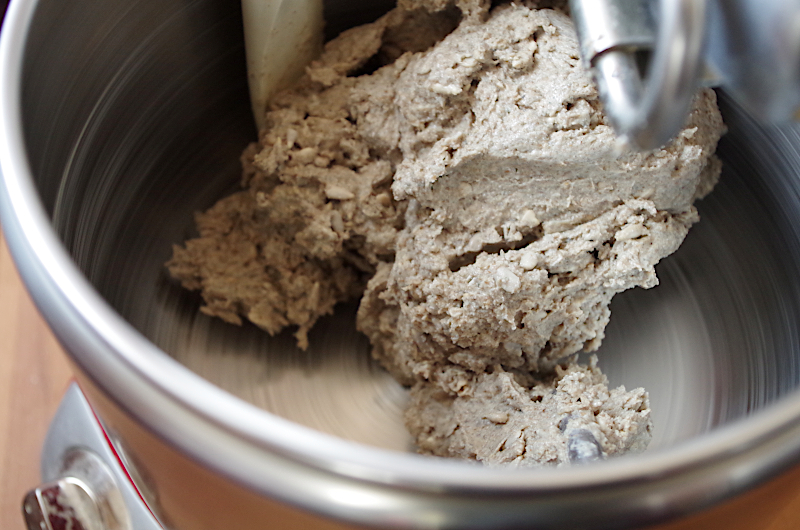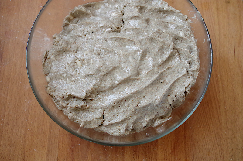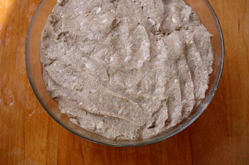 Если вы замешиваете в тестомесе (меня Ankarsrum и он прекрасно справляется с ржаным тестом), то, не заморачиваясь, можете все загрузить в чашу, установить крюки и на 2 скорости замесить однородное тесто, при необходимости долив воды. А, если вы с тестом один на один и есть только миска и ваши руки, то сначала размешайте в воду закваску, добавьте семечки и соль, перемешайте все, как следует, и тогда уже добавьте муку.