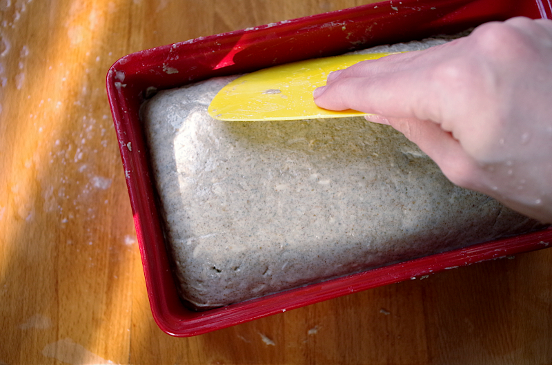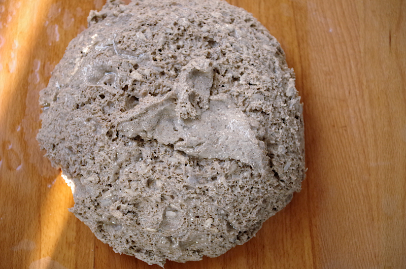Это тесто должно подойти, потом можно разделить, мокрыми руками слегка придать форму, уложить в форму и выгладить поверхности силиконовой лопаткой или мокрым мягким скребком. Если сразу после брожения в форму хотите, постарайтесь равномернее уложить.