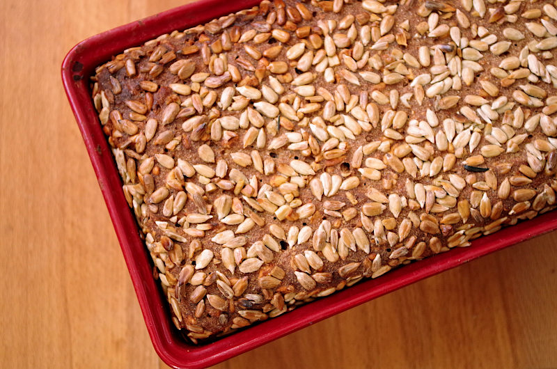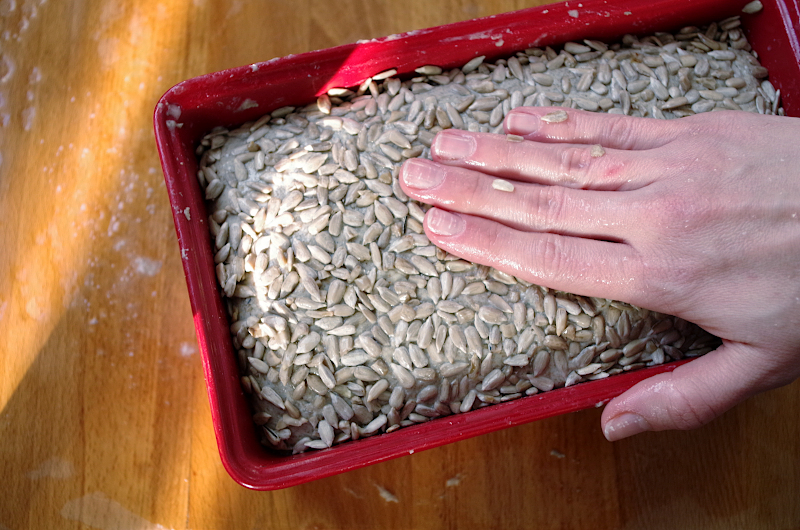 Присыпьте поверхность хлеба семечками, мокрой рукой слегка придавите их, так они почти не будут осыпаться.