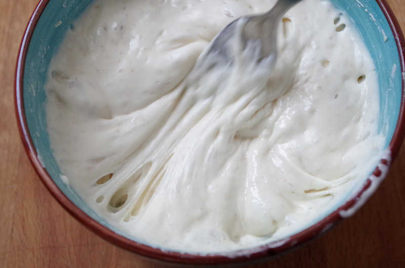 В воде размешайте закваску, добавьте муку, перемешайте до однородности, затяните пленкой и оставьте на 12-12 часов созревать. Если у вас прохладно, возьмите 10 гр. стартера, если тепло, достаточно будет 5-7 гр. Зрелая закваска станет пузырчатой, будет пахнуть приятно молочнокисло.