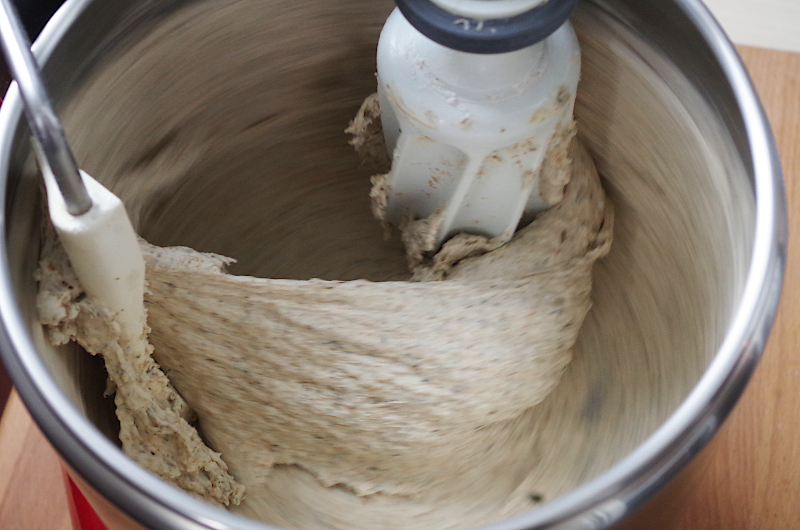 После аутолиза добавьте соль, продолжите замес на 2й скорости до гладкости. У меня на это ушло около 15-17 минут, но лучше ориентироваться именно на тесто, поскольку время замеса сильно зависит от свойств муки.