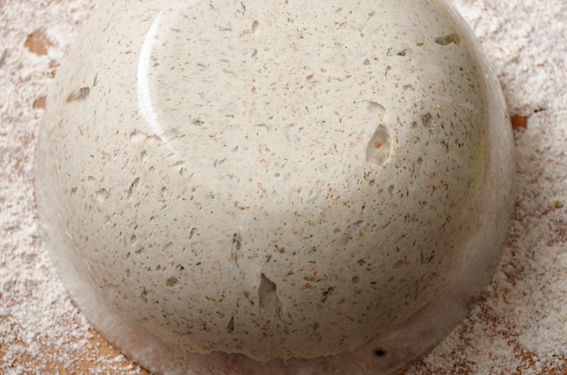 Тесто переложите в миску (желательно прозрачную), смазанную растительным маслом, сверните в шар. Брожение около 2,5 часов при 25°, через 40 минут один раз сложите тесто, хорошо его потянув.