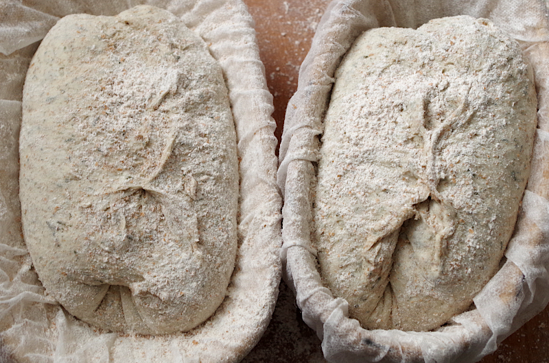 Туго сформуйте овальные или круглые заготовки и уложите в корзинки (у меня корзинки такого размера - 23х13 см. или даже чуть меньше)) швом вверх. Я формовала овальные пеленанием, этот способ позволяет хорошо затянуть заготовку, но при этом не нарушать внутреннюю структуру теста, он идеально подходит для хлеба из влажного теста. Расстойка 60 минут при 25°, сразу после формовки начните греть духовку с камнем и колпаком (если печете под колпаком, я пользуюсь колпаком Emile Henry и камнем Rommalsbacher), температура 240-250°.