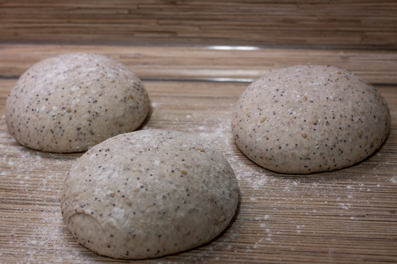 Через полтора часа брожения выложите его на подпыленный мукой стол и разделите скребком на куски, округлите их и оставьте на 10-15 минут для расслабления теста.