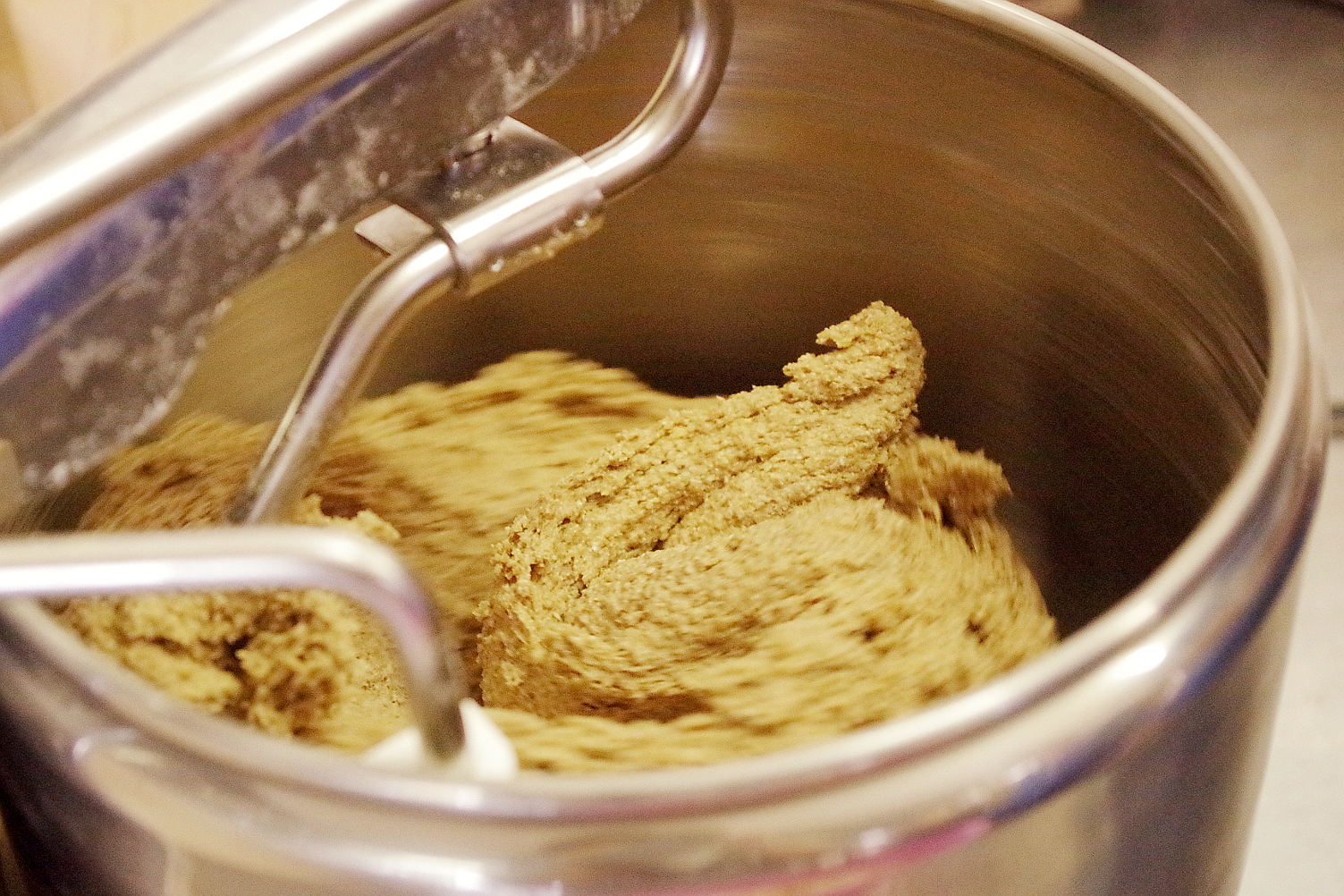 Замешивали тесто в домашнем тестомесе Ankarsrum Original и руками, несмотря на то, что это именно бытовой тестомес, он вполне справился с задачей: мы замесили в нем более чем 4 кг пшенично-ржаного цельнозернового теста, из которого испекли 6 хорошеньких буханок Машиного хлеба. Заместив тесто для одного вида хлеба, тут же начинали месить для следующего. Закончили печь мы почти ночью, но это и не удивительно, те, кто пекут на закваске, знают: от замеса теста до готового хлеба порой нужно 6-7 часов.