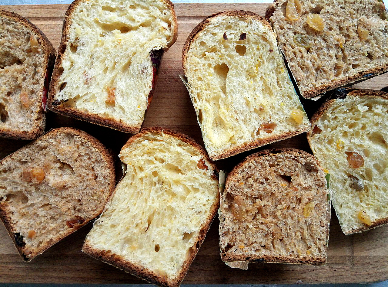 После этого мастер-класса у меня был день передышки и подготовки к следующему МК по заквасочным куличам, а этот МК заслуживает отдельной истории. Как я говорила выше, во Владимире мы тоже пекли куличи, и там я поняла, что нужно кое-что менять в подготовке к мастер-классу, а именно – добавлять еще один замес теста, чтобы хотя бы одну партию сдобы успеть испечь непосредственно на МК. А, поскольку мне нужно было показать не просто куличи на закваске, а еще и то, как технология замеса влияет на формирование структуры мякиша, подготовка превратилась в замысловатый ритуал. Идея была такая: заранее замесить цельнозерновое тесто: одно руками, второе тестомесом, выбродить его и прямо перед МК разбросать по формам и оставить подходить в надежде, что оно успеет и мы все-таки испечем, что хотели. Следом замесить такое же тесто (цельнозерновое - тоже одно руками, второе тестомесом), и оставить его подходить, чтобы уже на МК вместе с участниками разделить его и разложить по формам расстаиваться (испечь такое мы никак не успевали). То же самое сделать на МК – замесить руками и тестомесом, чтобы, собственно, показать различный замес, различное развитие клейковины и, как итог – разницу в формировании мякиша и вкуса. И то же самое в такой же последовательности сделать с тестом из белой муки: замесить в двух вариантах раз, замесить два, замесить на МК – три, и все для того, чтобы суметь и успеть показать на мастер-классе, как же все-таки печь эти куличи на закваске. Чтоб вы понимали, то, что происходило у нас на мастер-классе – было вершиной айсберга, чтобы показать которую, пришлось сильно постараться и напрячь мозги. После моих поездок во Владимир и Тольятти, после МК в школе у меня настолько туго соображала голова, что приходилось оставлять себе записки: тесто ручного замеса – печь, тесто механического замеса – бродить, опара для замеса на МК, и все в таком духе.