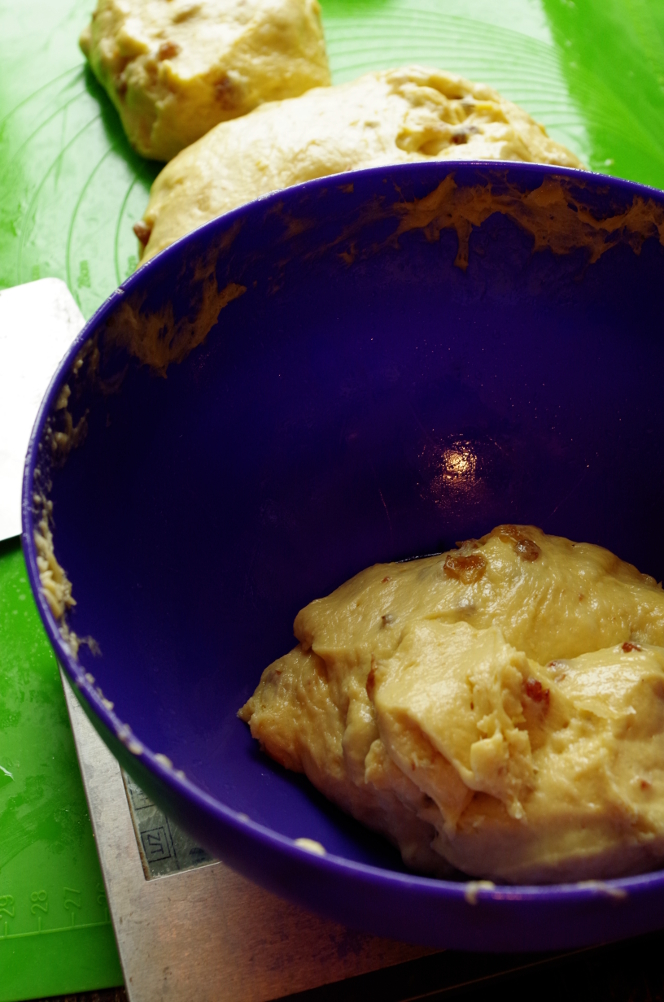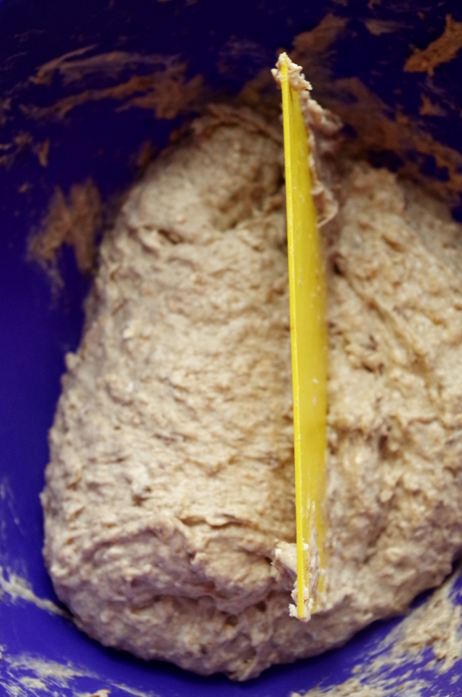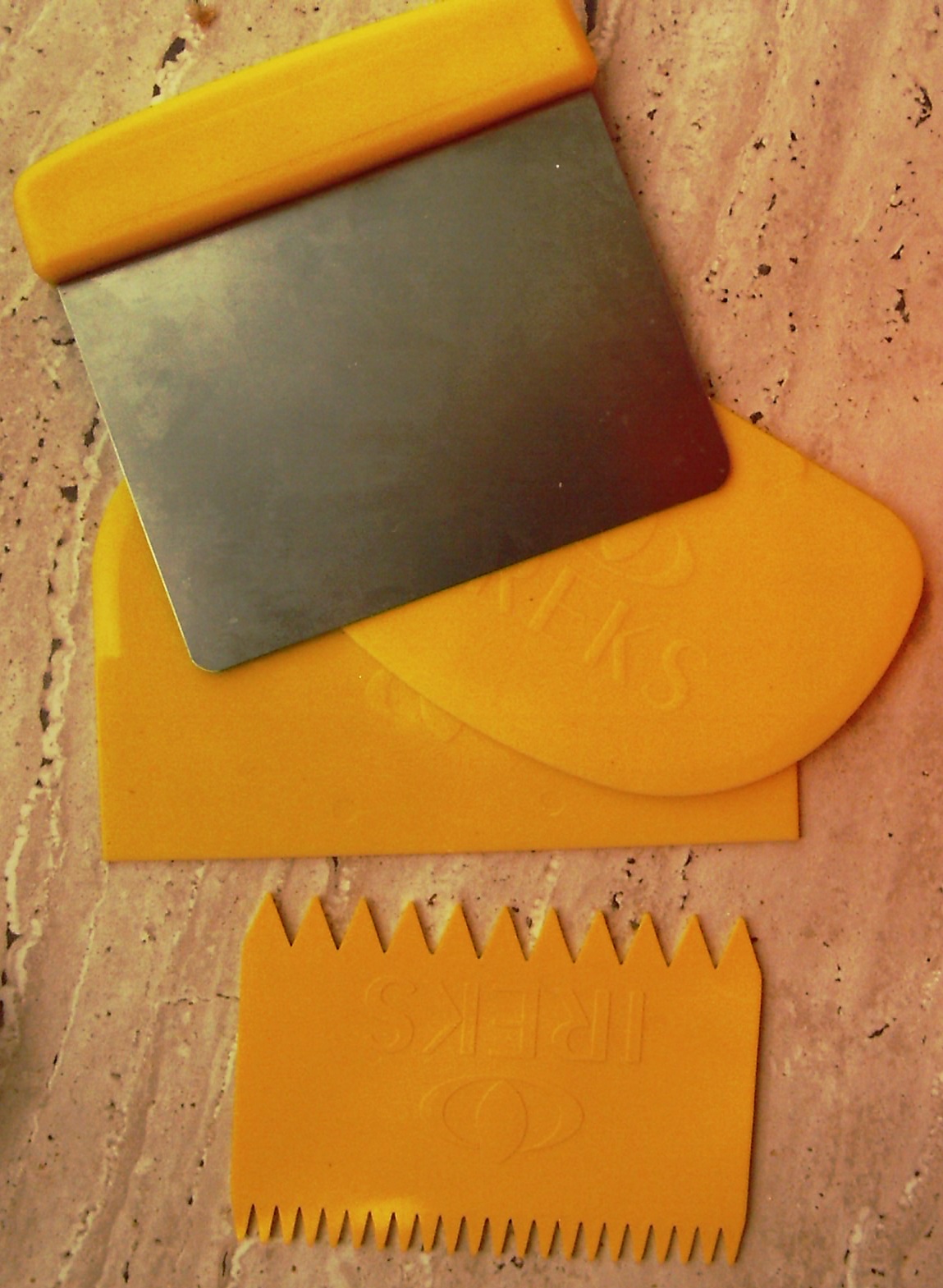У меня есть набор скребков, с помощью которых можно замешивать, смешивать, разделять на куски. Один металлический, прочный, с пластиковой ручкой, очень удобный. Им здорово разделывать тесто на куски и подчищать рабочую поверхность от прилипшего или присохшего теста и замешивать влажное липкое тесто. Пластиковыми хорошо выскребать тесто из миски на рабочую поверхность, они гнуться, поэтому позволяют очень чисто выскрести миску, это особенно хорошо для влажного теста, которое во время брожения иногда сильно прилипает ко дну и стенкам миски.