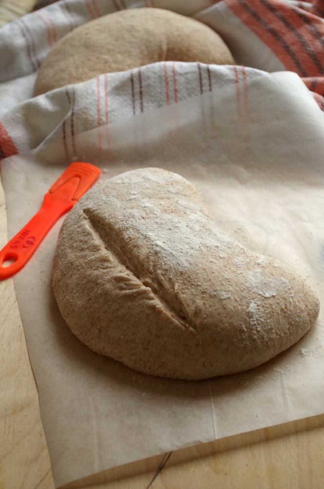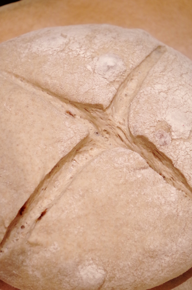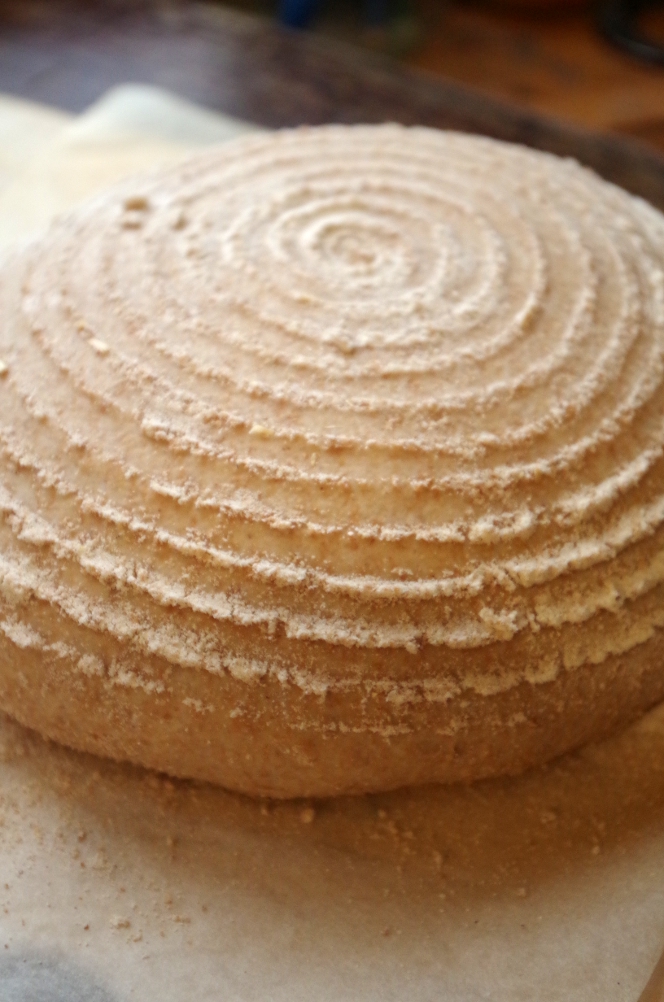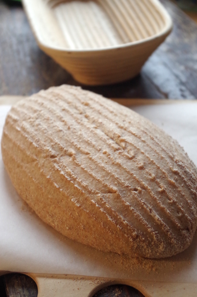 Корзинки покрупнее я брала уже у Хлебомолов, и они оказались настолько круче маленьких, что я глазам не могла поверить: хлеб, расстоянный в них, получается более округлым и пышным, правильной формы, корочка красивая и хрустящая, с красивыми надрезами. Все дело оказалось в объеме корзинок, тесто в просторных корзинках тесто чувствует себя свободнее, растет и вширь и вверх, словом, ему там очень удобно. Поэтому при выкладывании на пергамент оно не расплывается, не трескается снизу под собственным весом, а, сохраняя форму, отправляется в духовку расти и румяниться.
