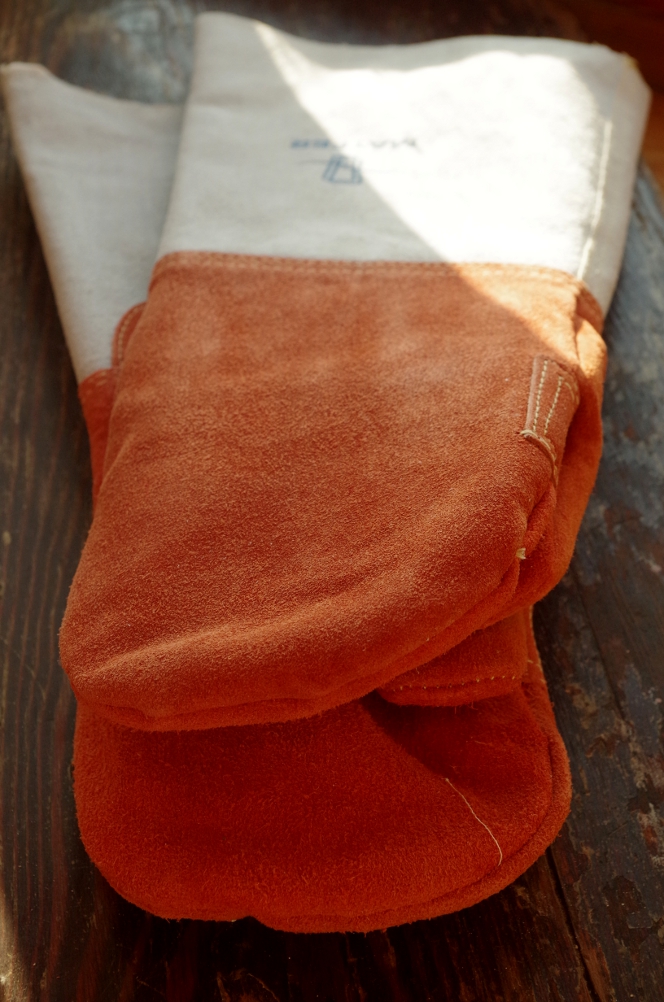 Вот без них у меня бы все руки были в ожогах. Когда достаешь из духовки миску или (особенно!) утятницу или форму с хлебом, есть большой риск не просто обжечь пальцы, но и зацепиться предплечьем за духовку или камень и получить знатный «кулинарный» ожог (что не раз случалось ранее). В моих рукавицах Matfer это практически не реально, они закрывают руки до локтя и при этом сами по себе настолько толстые и сделаны из такого материала, что вообще не пропускают жара достаточно долго. Я совершенно не спеша достаю из духовки колпак, не боясь обварить руки паром, и так же не спеша, ищу место, куда бы его поставить. Без паники и спешки вытаскиваю раскаленную чугунную утятницу. Рукавицам, без сомнения, жарко, помню, после того, как обкатывала стальную черную форму и часто в ней пекла, на рукавицах стали видны небольшие подпалины. Рукам же горячо не было ни разу, потому что рукавицы способны выдержать температуру до 300 градусов, не у всех духовка так греет! Рукавицы были бережно сшиты предусмотрительными французами из нескольких слоев натуральной ткани, внешний слой — плотная замша, а под ним несколько слоев различной плотности х/б-ткани, которая обладает низкой теплопроводность. Французы знают толк в хлебе и пекарских рукавицах :)