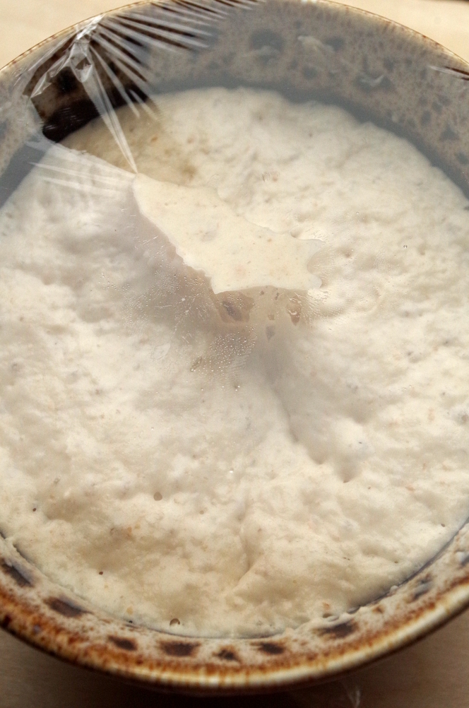 Важный момент. Тесто и опары/закваски во время ферментации/расстойки нужно обязательно хорошо накрывать, чтобы их поверхность не заветрилась. Кроме того, что сухая корочка на тесте просто не нужна, она ухудшает брожение, качество опары-теста и мешает определить, созрела ли опара. Из-за заветренной корочки просто не видно, как опара выглядит на самом деле, какова ее пористость, появились ли пузыри на поверхности. Нередко такие опары оказываются уже перезревшими и опавшими, что не очень хорошо для качества хлеба, и этого не заметно из-за корочки, которая, затвердев, не падает.