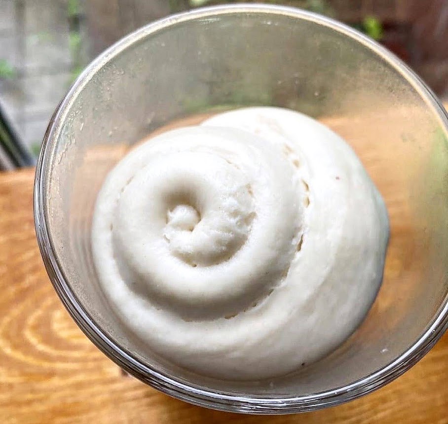 После проведите 3 освежения от созревания до созревания (это значит, что, когда закваска созрела, ее снова надо покормить), использую равные части закваски, муки и воды, то есть, поменяв влажность ЛМ и доведя ее таким образом до 100%. Более жидкая консистенция и схема освежения благоприятны для развития дрожжей и увеличения подъемной силы закваски, поэтому после таких освежений закваска должна стать ощутимо активнее. Некоторые пекари замешивают тесто для панеттоне, бриоши или другой сладкой сдобы прямо на такой жидкой закваске, пересчитывая влажность в рецепте.