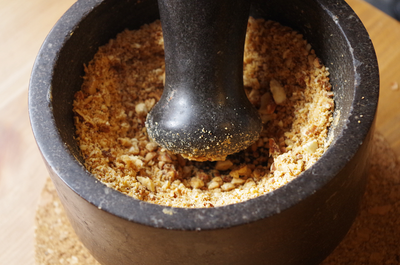 Орехи поджариваем в духовке до вкусного аромата и золотистого румянца и тут же, пока горячие, давим в мраморной ступке.