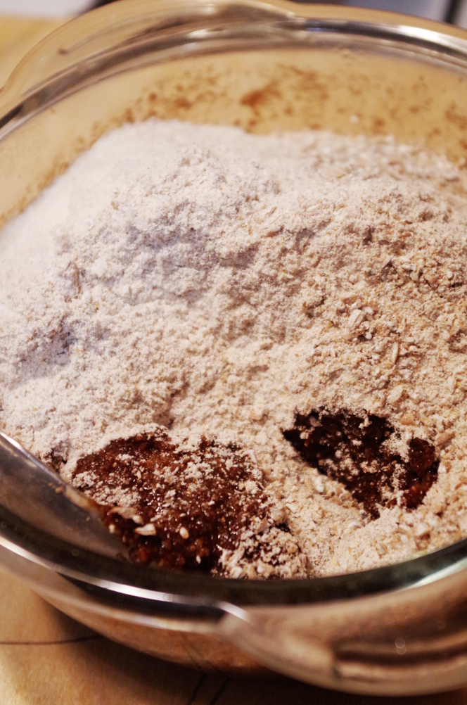 250 гр. Произвольной смеси пшеничной и ржаной цельнозерновой муки (У меня 100 гр. пшеничной цельнозерновой и 150 гр. ржаной цельнозерновой);