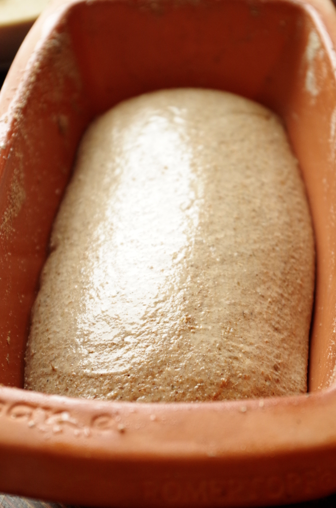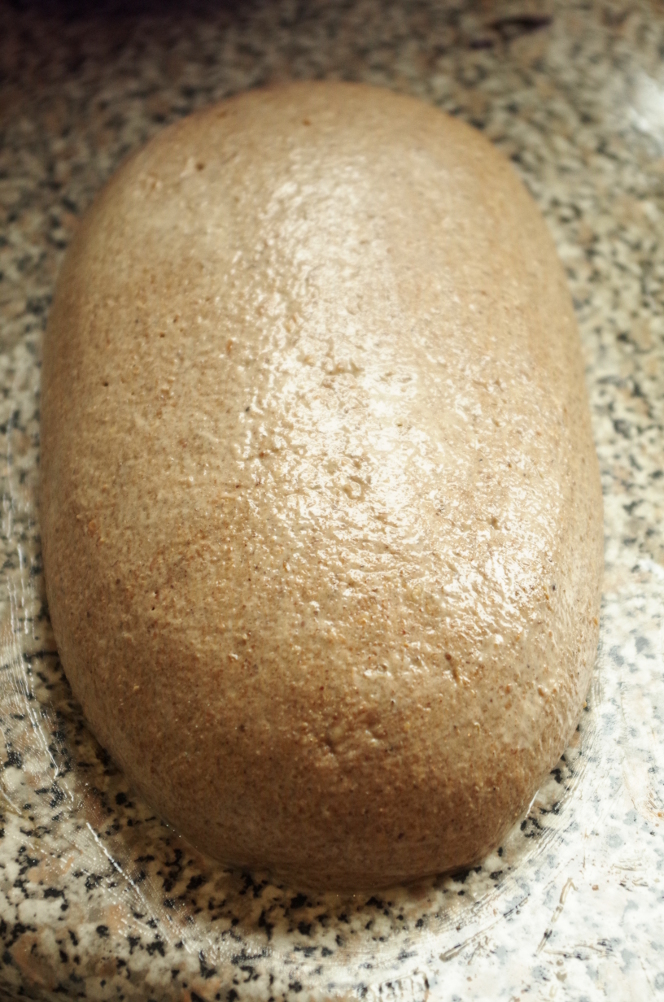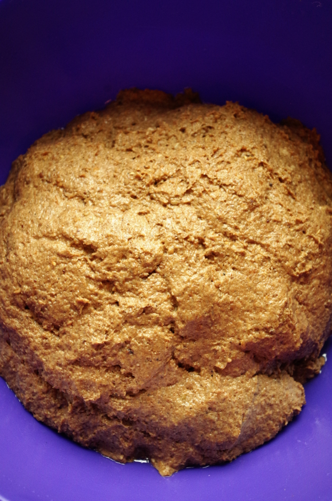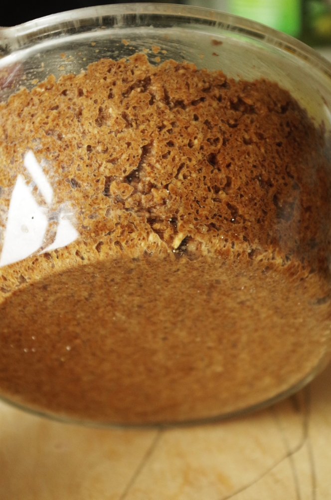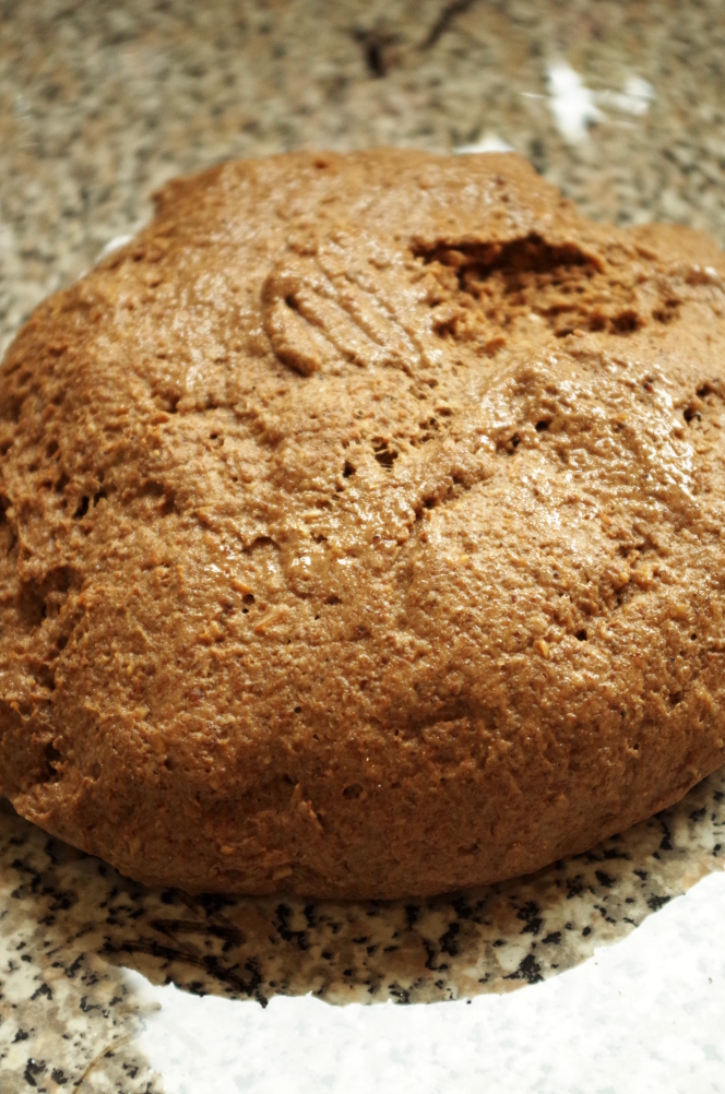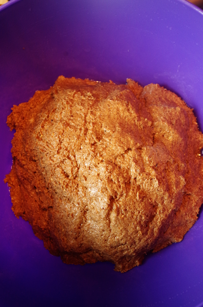 Все как следует смешиваем, но и не вымешиваем, как пшеничное тесто, однородности вполне достаточно. Аккуратно приглаживаем поверхность в миске и оставляем бродить на 1,5 часа при комнатной температуре.