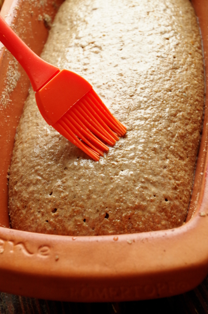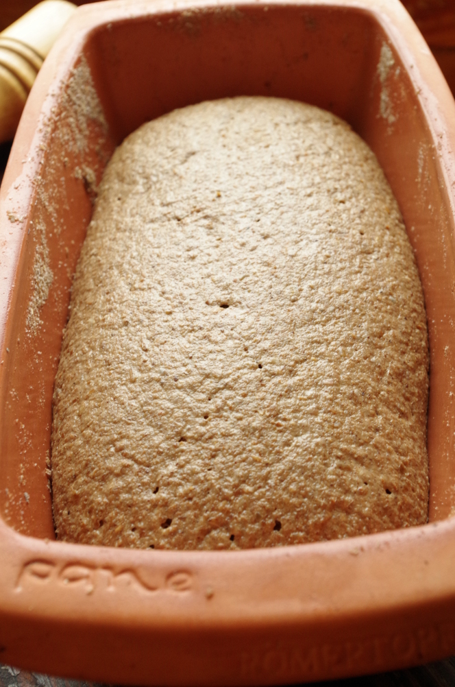 Перед посадкой смазываем верхушку хлеба водой и отправляем в печь, через 10 минут температуру снижаем до 200 и печем около 50-60 минут. Точное время зависит от духовки и от формы, в которой печется хлеб. Я пекла в керамической Roemertopf, поэтому время выпечки немного увеличивала. Надеваем толстые рукавицы и достаем форму с хлебом. Я свои замшевые рукавицы нежно люблю, они же практичсеки противопожарные!