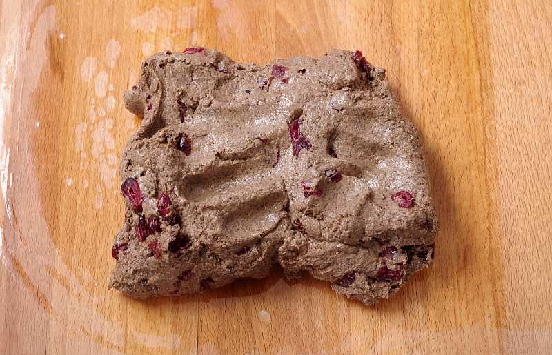 Замес на 2-3 скорости до однородности, потом добавьте клюкву и перемешайте.