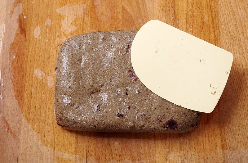 Оставьте на 15-20 минут. Достаньте тесто на смоченную водой поверхность, мокрыми руками с помощью пластикового скребка сформуйте аккуратный кирпичик.