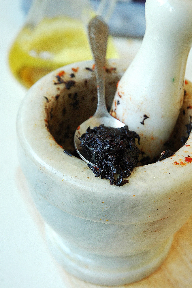 В ступке растираем чеснок со столовой ложкой соли в пасту. Добавляем пару томатов (это можно пропустить, потому что сушеный томат нелегко толочь в ступе), толчем и растираем, чтоб получилось вот так.