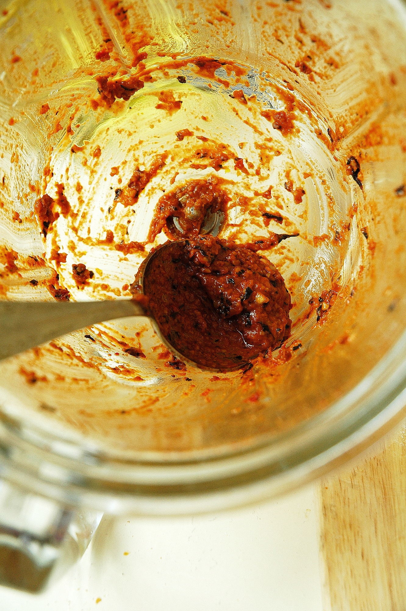 В самом конце добавляем тертый сыр. Вот на этом этапе, когда все перетолклось, пустило сок и масло, можно и блендером воспользоваться. При перемешивании на высокой скорости добавила оливковое масло, пару ложек томатной воды, которая осталась от замачивания томатов, и немного лимонного сока. Я до конца не знала, что получится и будет ли вкусно. Но когда попробовала, поняла, что ни одной капельки этого соуса от меня не уйдет!