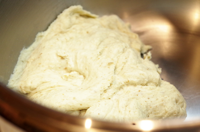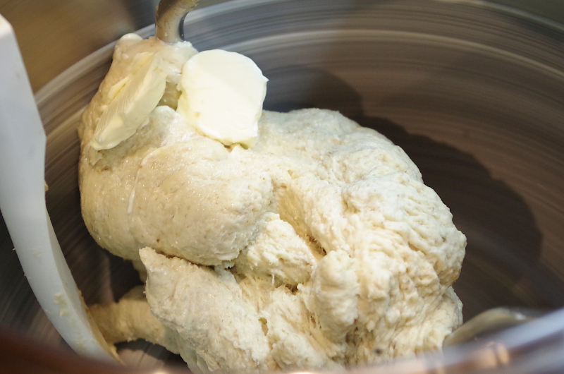 Смешайте все ингредиенты, кроме сливочного масла, оставьте тесто для аутолиза на 30 минут.