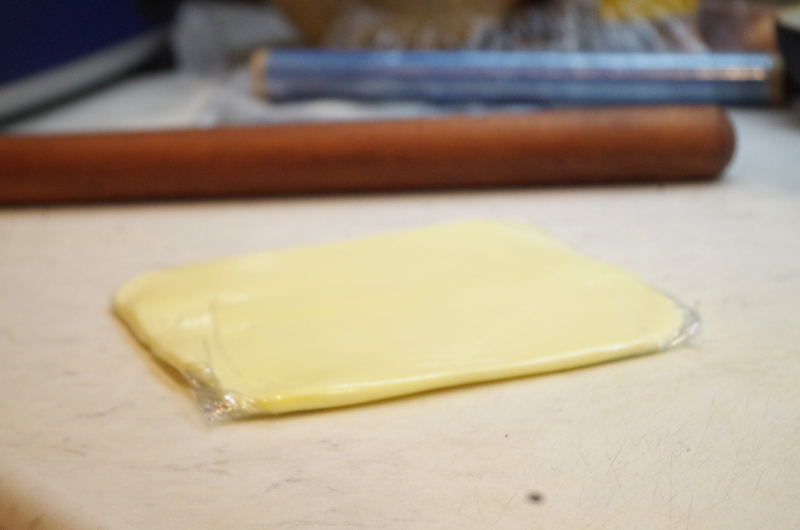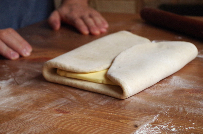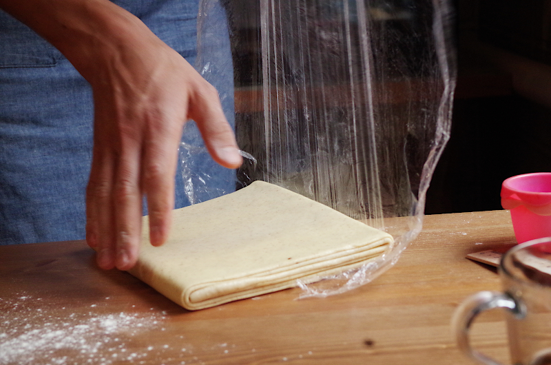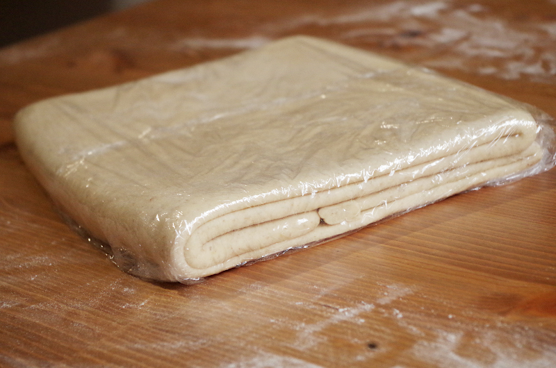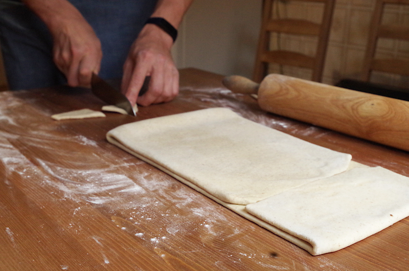 Обрежьте неаккуратные края без масла. Заверните их в пленку, потом вы сможете их использовать как спелое тесто для замеса следующего теста для круассаном или хлеба.