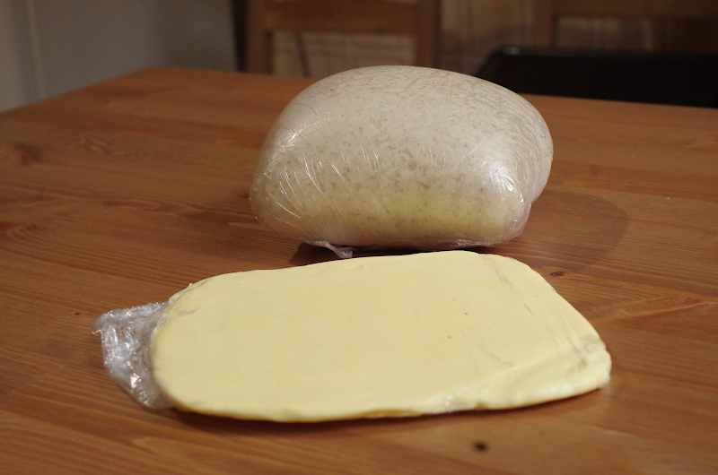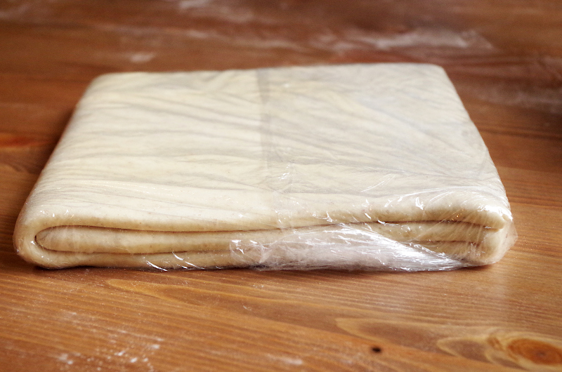 Потом разделите на две части, заверните в пленку, отбейте и, раскатывая, сформируйте прямоугольник. Уберите в холодильник на 8-12 часов при 5-7°.