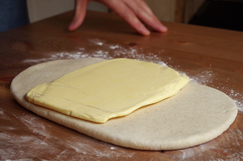 Охлажденное тесто раскатайте в прямоугольник, длина которого должна позволить завернуть пласт масла,так, чтоб края были внахлест и по бокам оставалось немного места, чтоб масло не вылазило.