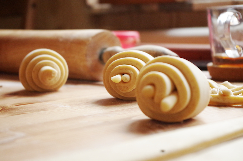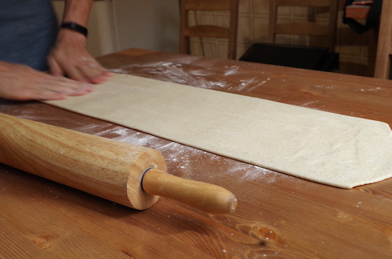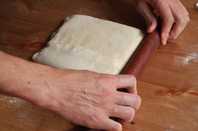 Не переворачивая тесто, раскатайте вдоль сформировавшегося шва (“ключа”) до толщины 4-5 мм. После продавливания скалкой на видео вы можете не заметить шва, но он есть, если присмотреться))