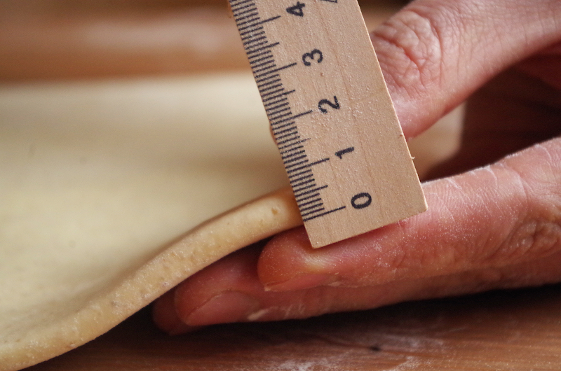 - Перед тем, как складывать, проверяйте равномерность раскатки, проведя рукой по тесту.