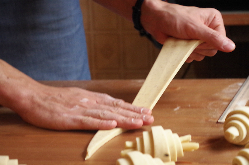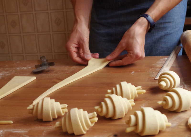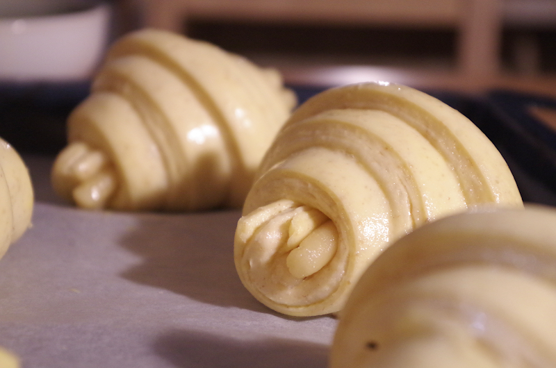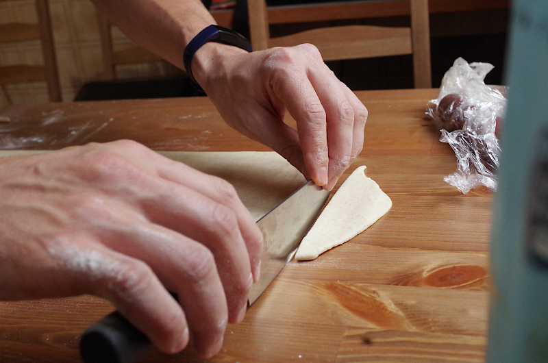 На этом этапе вы можете завернуть в основание круассан начинку. Мы иногда делаем с марципаном, очень вкусно получается! Для одного круассана нужно всего 10 гр. хорошего марципана, раскатанного в тонкую колбасу.