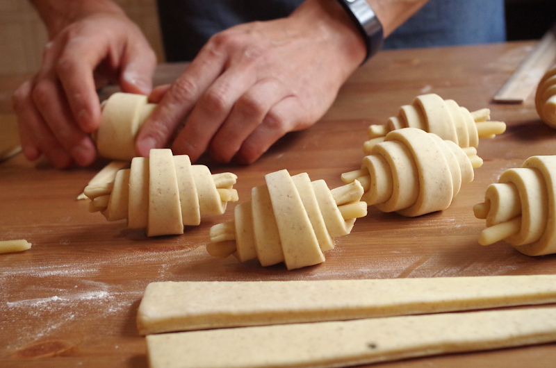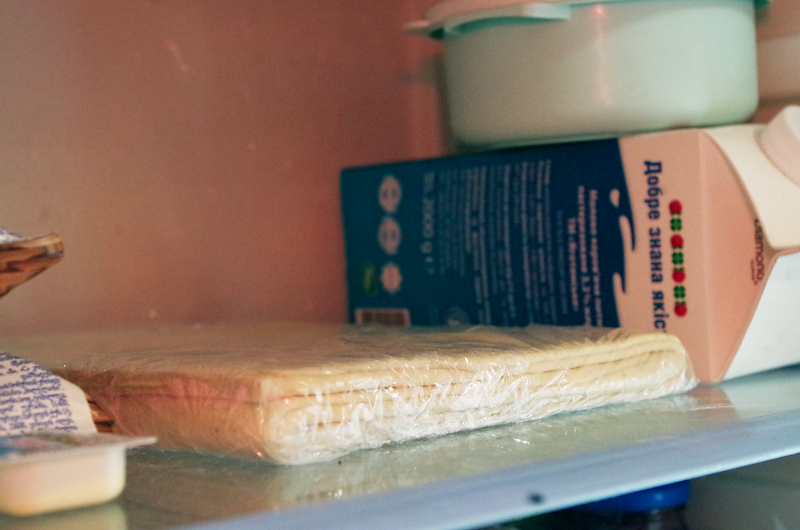 Положите тесто в холодильник на 60 мин. при 5-7°. Задача полностью охладить тесто и позволить ему расслабиться после раскатки.