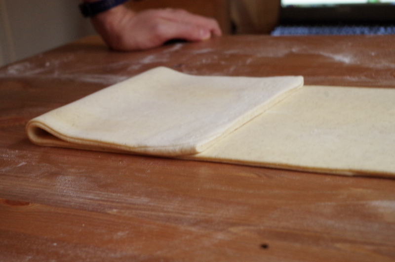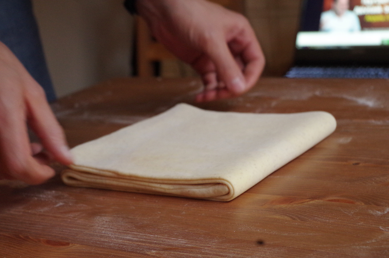 Сложите тесто простым туром: один край теста заверните чуть дальше середины, накройте другим краем так, чтоб ничего лишнего не выглядывало и тесто выглядело, как аккуратная книжка.