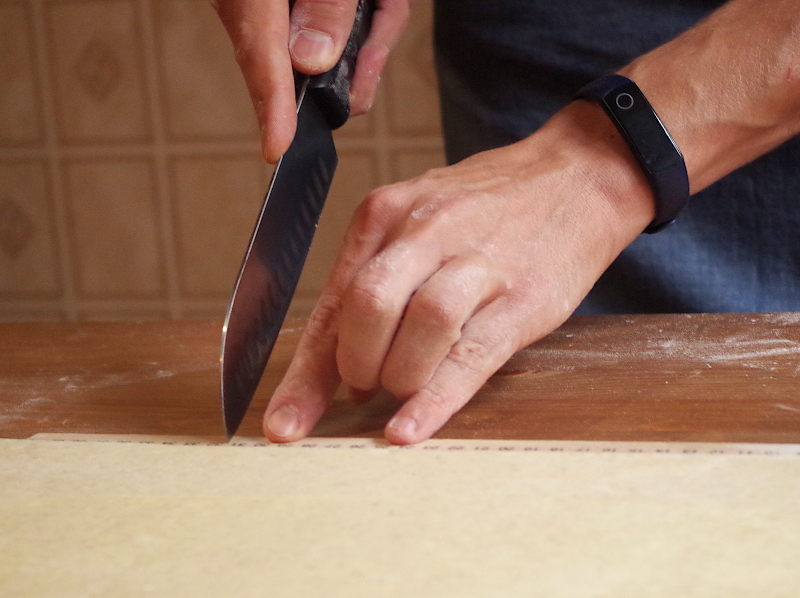 Еще раз измерьте ширину пласта теста и разделите ее на три. В нашем случае, если ширина 30 см., то, разделив на 3, получим 10 см. С помощью ножа и линейки сделайте надсечки с интервалом 10 см. сначала по одному длинному краю теста. После сделайте то же самое по другому краю, но начните с 5 см., а потом надсекайте с интервалом 10 см. Это будет высота треугольника.