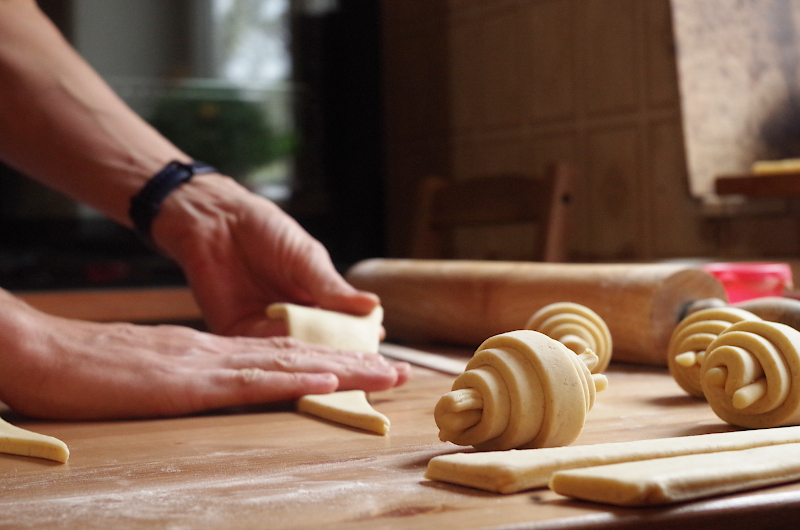 Оптимально печь круассаны на натуральной закваске Sekowа, вы можете посмотреть информацию об этом закваске по тегу Sekowa, нажав на ссылку. Но до последнего времени Артур пек круассаны на домашних фруктовых дрожжах и на обычной закваске-спонтанке, но в итоге остановился на Sekowa. Поскольку это натуральная, но стабильная культура, кислот накапливает столько, чтобы мощно раскрыть вкус и аромат, не привнося лишней кислинки, как спонтанка, а скорость расстойки при этом несколько быстрее, чем на фруктовых дрожжах, Зекова оказалась для нас отличным выходом! Как и в домашних заквасках, суть Зековы в симбиозе молочнокислых бактерий и дрожжей, но соотношение этих ребят вполне определенное, поэтому большого количества кислот она не накапливает, а сбраживает довольно активно. Восстановленная из сухого концентрата стартовая культура живет в холодильнике, не теряя подъемной силы, около 3-4 мес., кормить ее не надо, если начнете - потеряет стабильность и превратится в обычную спонтанку)) Используют ее, как обычную закваску, давая зреть опаре при 27-30°. В обещм, на этом замолкаю про Зекову, хотие подробнее - жмите ссылку, хотите купить - прошу в магазин))
