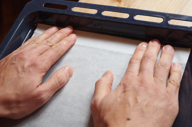 Достаньте тесто, снимите пленку (пленку не выбрасывайте, она совсем скоро пригодится), продавите немного скалкой и раскатайте до толщины 4-5 мм.
