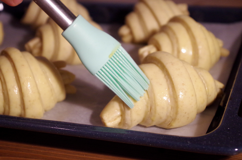 Расстоявшиеся круассаны заметно вырастут и будут нереально мягкими, как облако! Проверьте расстойку, дотронувшись до них и почувствовав эту мягкость. Смажьте яйцом перед выпечкой.