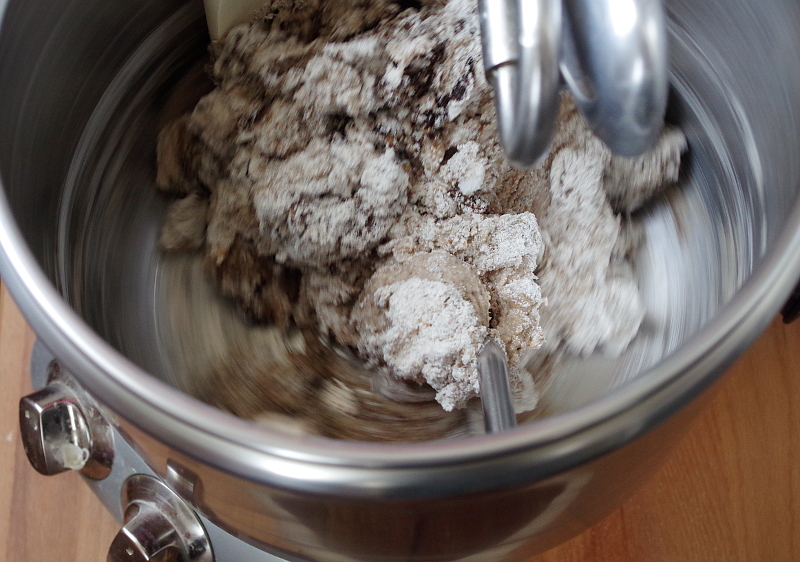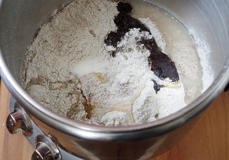 В чаше тестомеса смешайте сразу закваску, муку, воду, заваренный солод и все, что по списку. Замес - до однородности. Если у вас спиральный (плантарный) миксер, используйте широкую К-насадку и при необходимости помогайте лопаткой, если Ankarsrum Original,замешивайте с помощью крюка, он идеально справляется с таким тестом и качественно все промешивает, даже помогать не надо.