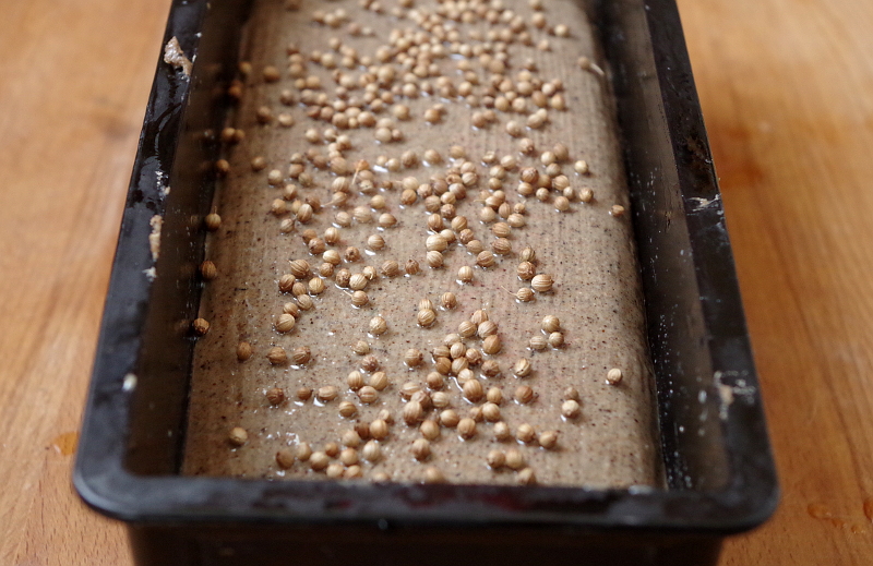 Хорошо утрамбуйте и разровняйте тесто до гладкости мокрыми руками и мокрой силиконовой лопаткой. Смажьте поверхность растительным маслом и присыпьте кориандром, слегка придавите рукой.