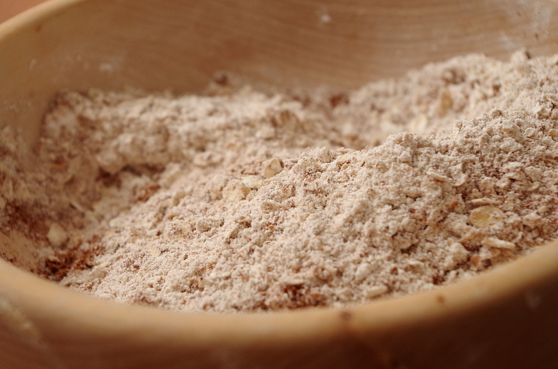 Я делала все в тестомесе Ankarsrum Original, у него есть удобная чаша для кондитерки, и два вида венчиков. Если у вас при себе только миска и ручной миксер - тоже справитесь. Муку смешайте с овсянкой, добавьте соль, соду, разрыхлитесь и специи и хорошо все перемешайте.