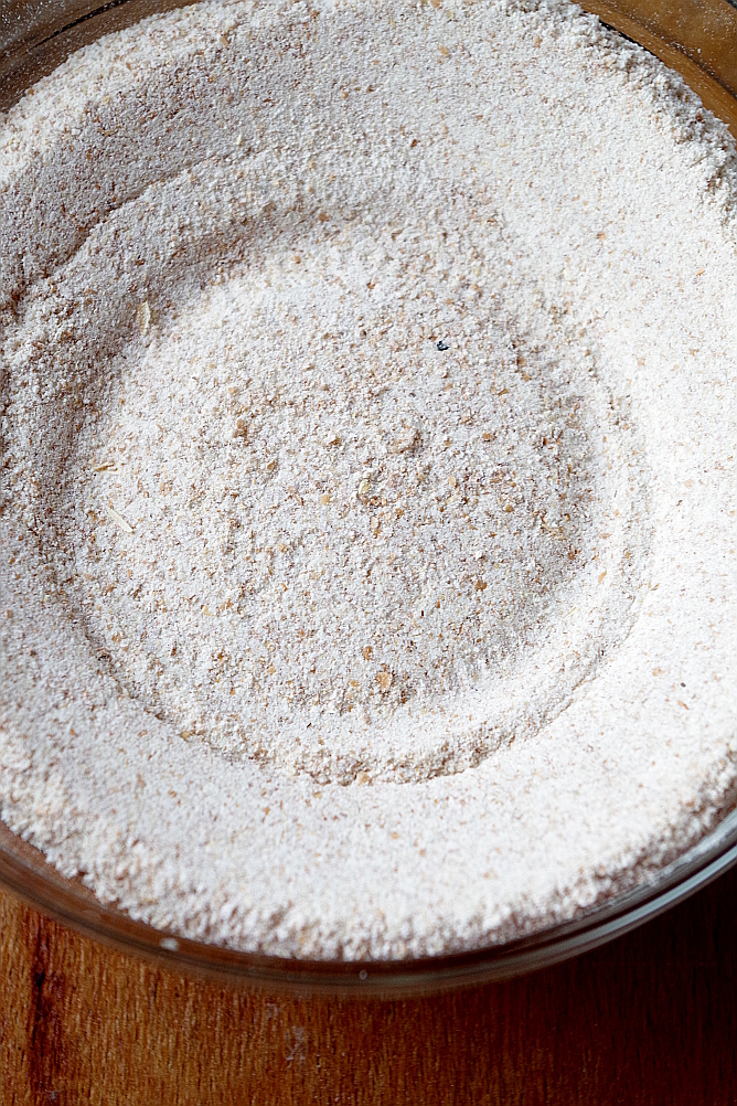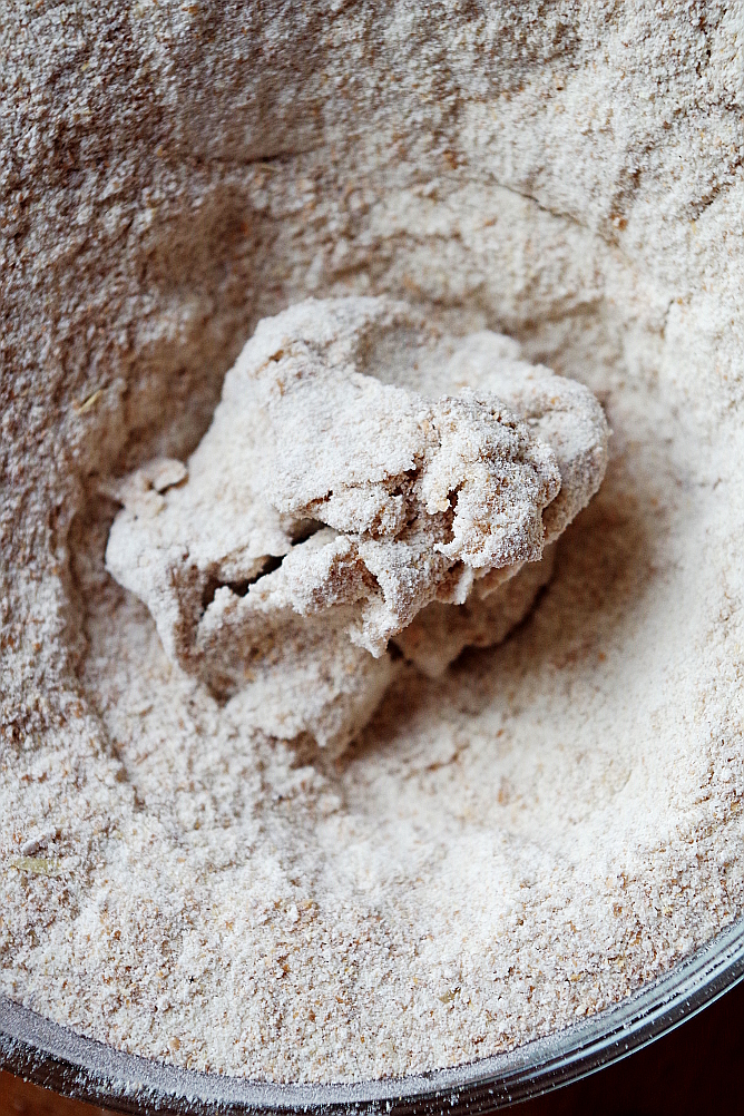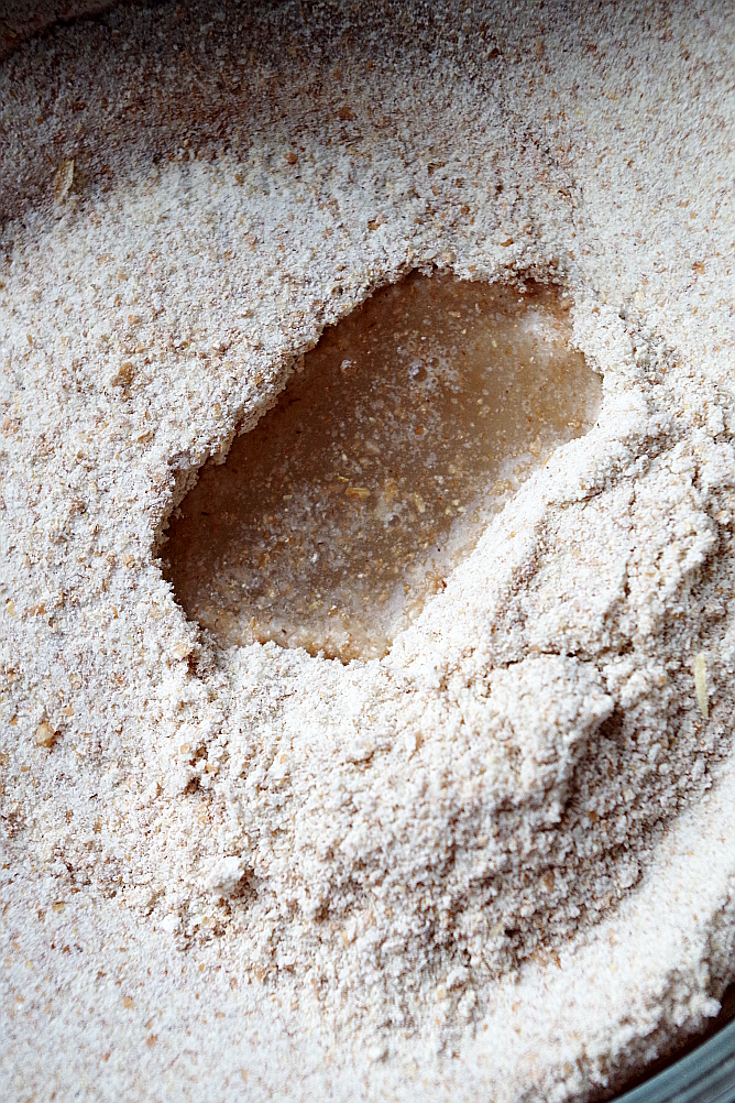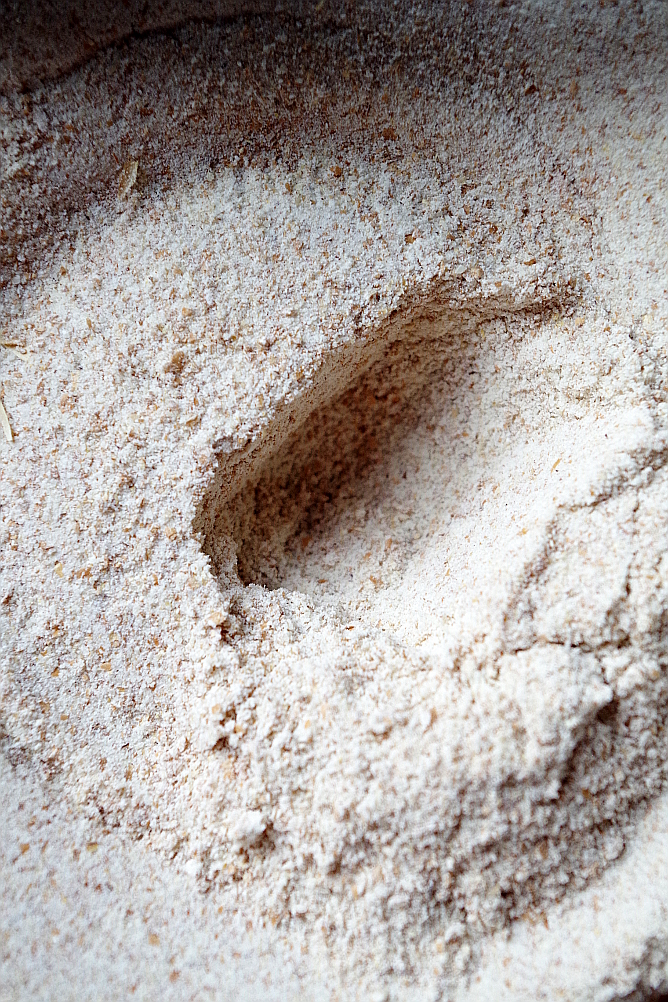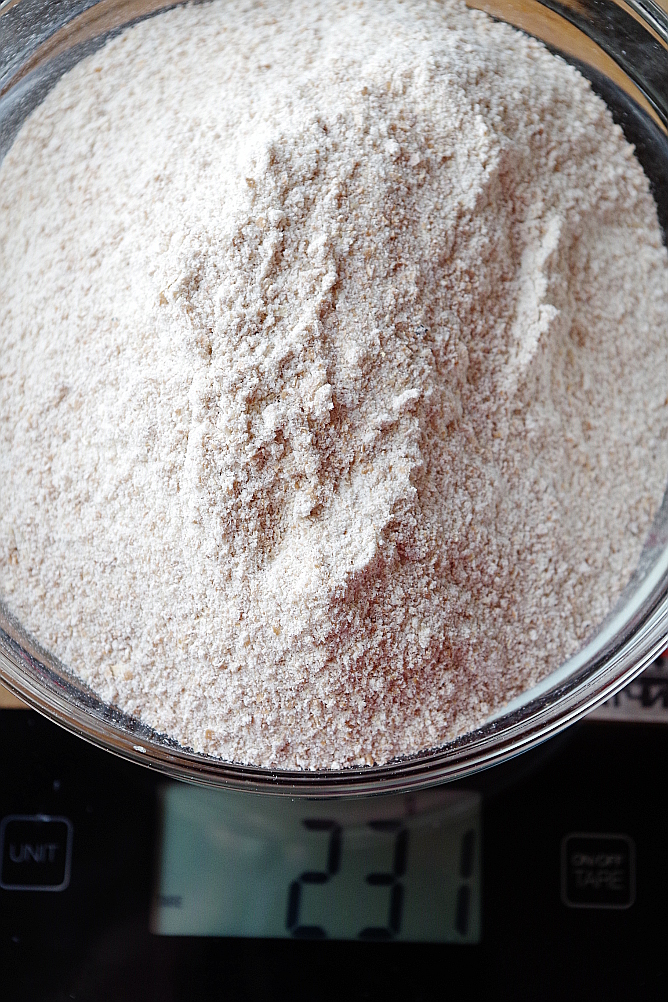Из-за того, что цельнозерновая мука впитывает больше влаги, чем белая, приходится корректировать количество воды, чтобы тесто не получилось слишком густым. Как правило, с этим нет проблем и добавлять воду можно по ходу замеса, ориентируясь на консистенцию теста и количество цельнозерновой муки в нем. Но если вы хотите знать наверняка, какова влагоемкость вашей цельнозерновой и белой муки и сколько точно лить воды, в тесто, это можно выяснить опытным путем. Этот метод описал Л.Я, Ауэрман в книге «Технологии хлебопекарного производства», им можно с уверенностью пользоваться и определять влагоемкость муки с точностью до 1% (но впервые я увидела этот способ у Люды (Mariana-aga) в блоге, ссылку дать не могу, потому что она удалила свой жж).