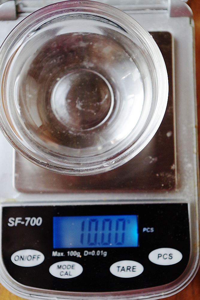 1) В поллитровую банку или похожую емкость насыпьте муки и слегка утрамбуйте ее (донышком подходящей чашки, к примеру). Я взяла свежесмолотую пшеничную цельнозерновую муку, которой «от роду» было дня три не больше. Отдельно взвесьте 10 гр. воды. В идеале для этого хорошо иметь точные весы с делением 0,1 гр., у меня как раз такие есть.