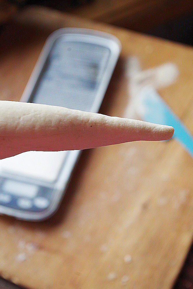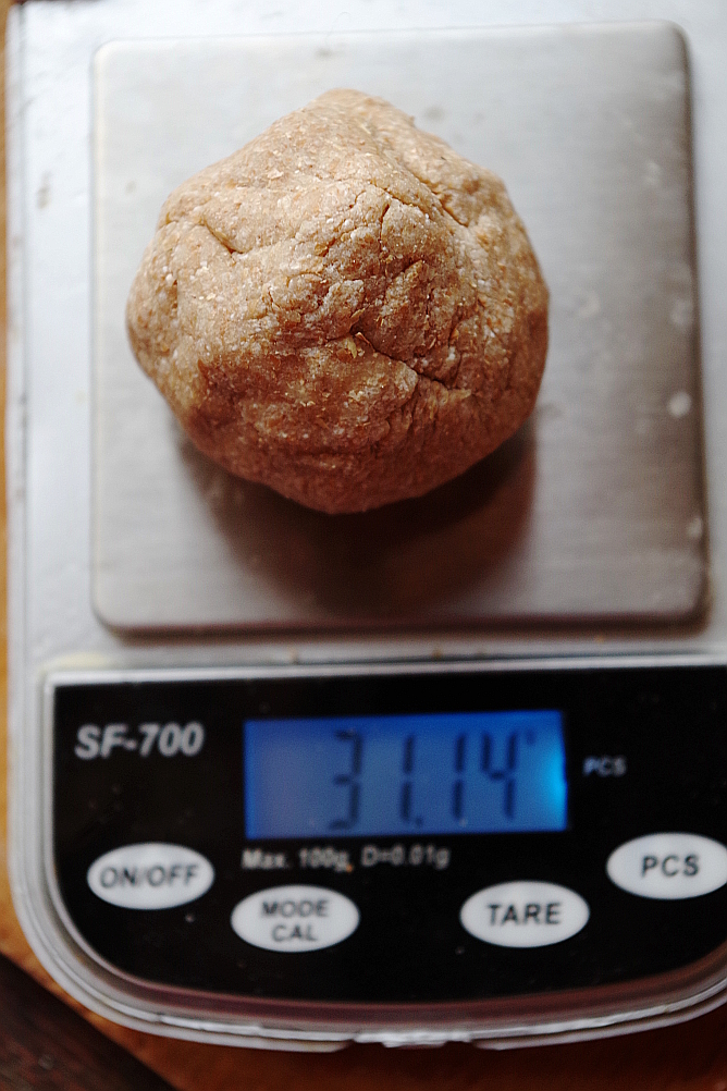 Мой комочек теста весит 31,14 гр., отнимаем 10 гр., получается 21,14 гр., это значит, что влагоемкость моей пшеничной цельнозерновой муки равна 47,3%. (1000 делим на количество муки в комочке и получаем процент воды, которую мука может впитать).