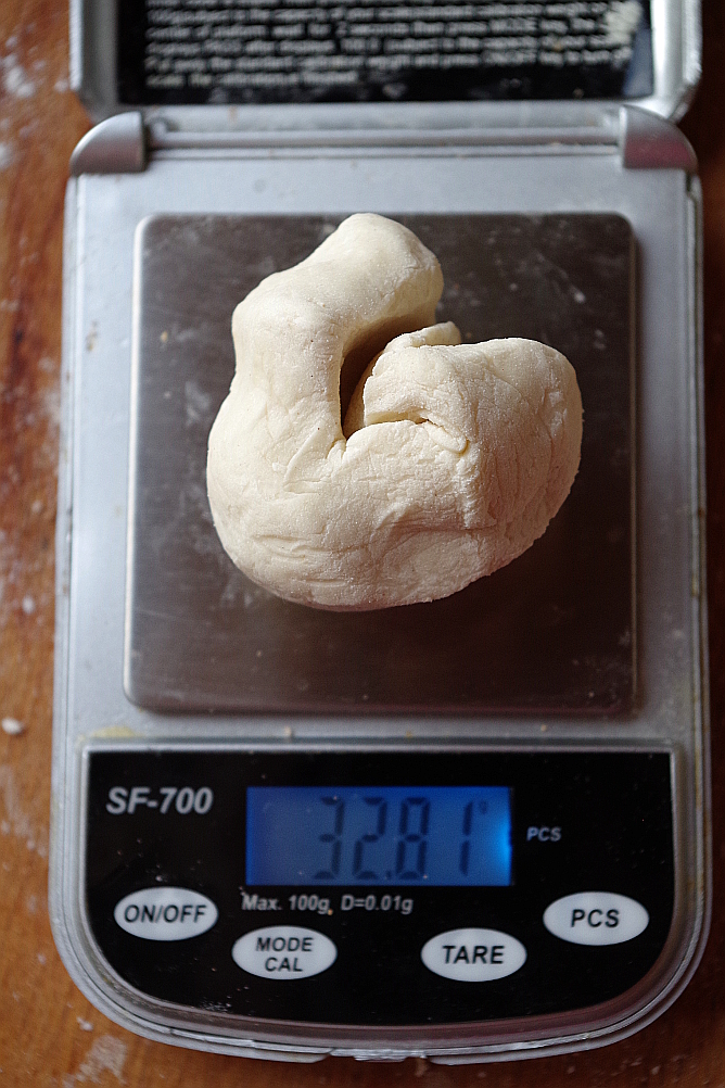 Показатель влагоемкости белой муки немного отличаются, но вычислить его можно точно таким же способом. Комочек из белой пшеничной муки у меня получился немного тяжелее цельнозернового — 32,81 гр., вычиатем 10 и получаем 22,81 гр. Влагоемкость белой муки равна 43,8%, немного меньше, чем цельнозерновой.