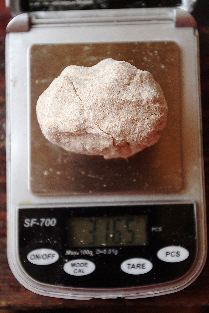 Проделала тот же фокус и получила вот такой комочек весом 31,65 гр. Вычитаем 10 гр., получаем 21,65. Влагоемкость этой муки составляет 46,1% - чуть меньше моей свежесмолотой. Но, как известно, жерновая мука вообще вбирает больше воды, так что не удивительно.