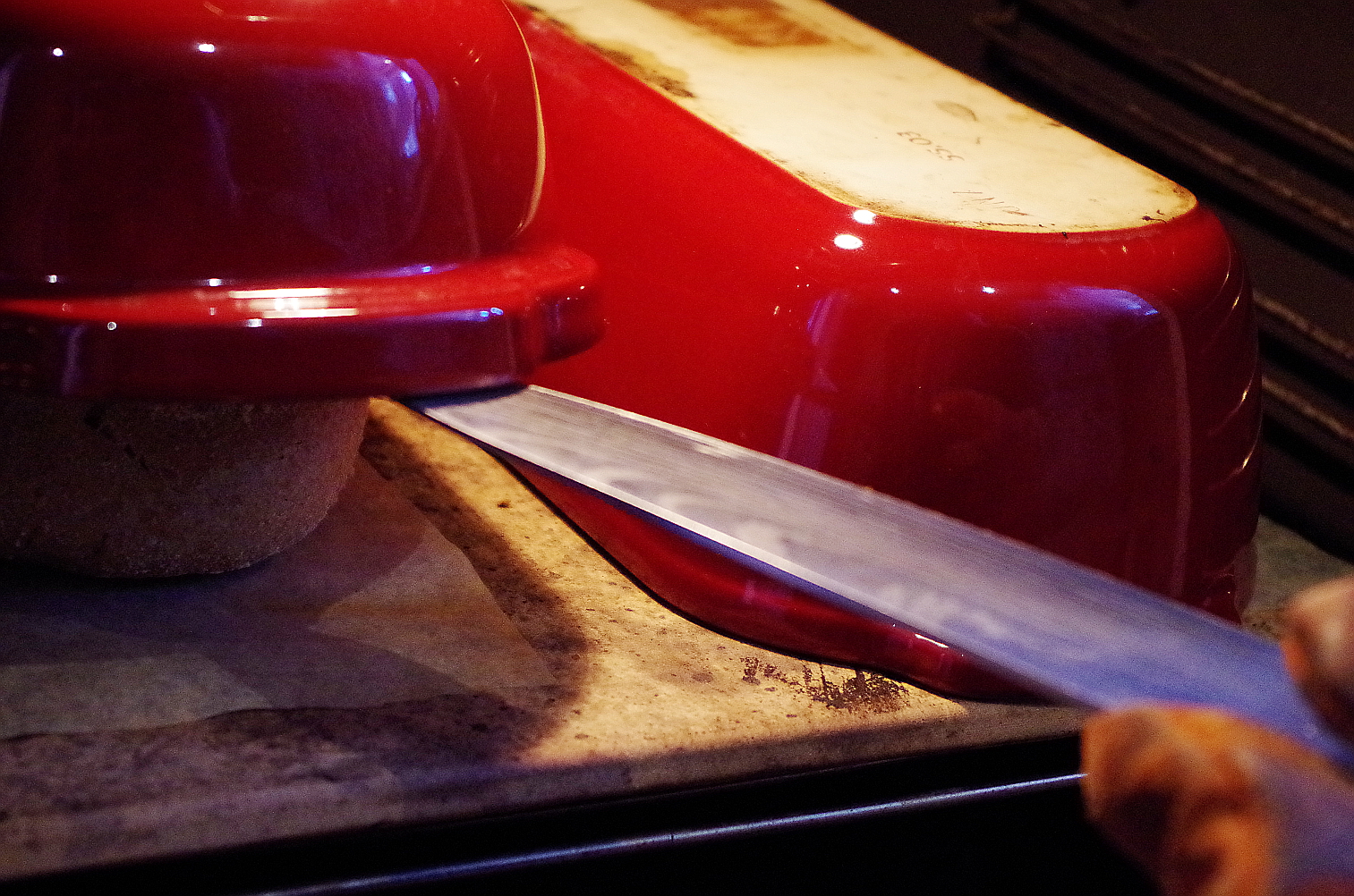 Пользоваться ею так же просто, как и круглой формой: ее нужно как следует раскалить, потом переложить в нижнюю часть расстоявшийся хлеб, надрезать, накрыть верхней частью и отправить в печь, через 15 минут пар убрать. С одной стороны, это просто, с другой – надо сделать все быстро: открыть духовку, достать форму, поставить куда-нибудь, чтоб она ничего не расплавила и не прожгла (то есть, место надо заранее подготовить), закрыть духовку, чтоб не уходил жар. Затем так же оперативно снять крышку, положить ее рядом, перенести в нижнюю часть формы хлеб, надрезать, накрыть раскаленной крышкой хлеб, открыть духовку, отправить туда форму с хлебом, закрыть духовку. Доставая форму из духовки, вам придется держать ее в руках какое-то время, пока не поставите в подходящее место, и потом возвращать в духовку, это вопрос нескольких секунд, но их хватит, чтобы, например, расплавить обычные кухонные рукавички с синтетическим наполнителем. Риск обжечься очень велик, поэтому заранее подумайте, что будет на руках: или толстые полотенца, или толстые варежки из натуральных материалов, или, например, вот такие пекарские рукавицы, как у сталеваров. У меня такие от Matfer, им года три не меньше, и со временем они все краше))