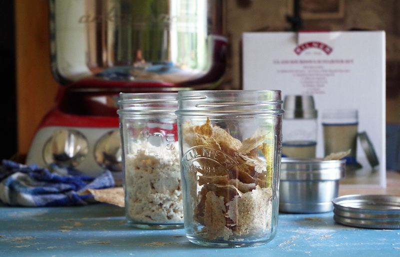 Второй способ, чтоб законсервировать на месяц или год (или по разным источникам на несколько лет от года до...5-10-20 лет). Размажьте созревшую закваску по силиконовому листу или пластиковому контейнеру, дождитесь, когда высохнет (без нагрева, без солнца, не в духовке), поломайте на кусочки, сложите в бумажный конверт.
