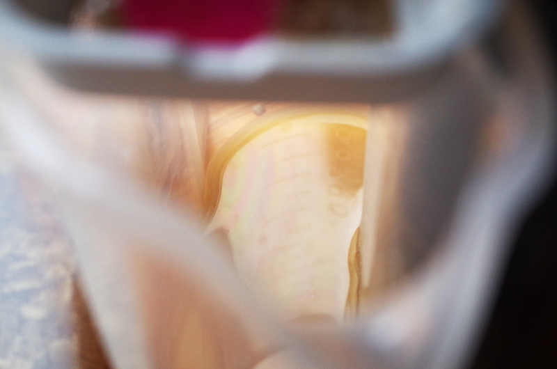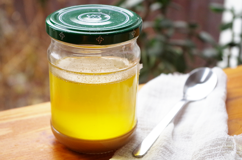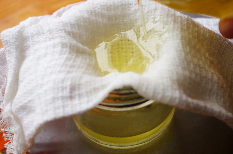 Для смеси масел растопила кокос до жидкого состояния (сильно греть не пришлось, температура плавления этого масла 36-40°). Баночку для смеси поставила на весы, через ткань процедила домашние ореховые масла.